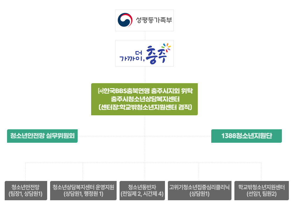 센터안내 인사말 센터소개 및 연혁 조직도 비전 및 미션 오시는길 청소년 상담전화 1388 충주시청소년상담전화 043-842-2007 팩스 043-854-1388 24시간 365일 운영 조직도 센터안내 조직도