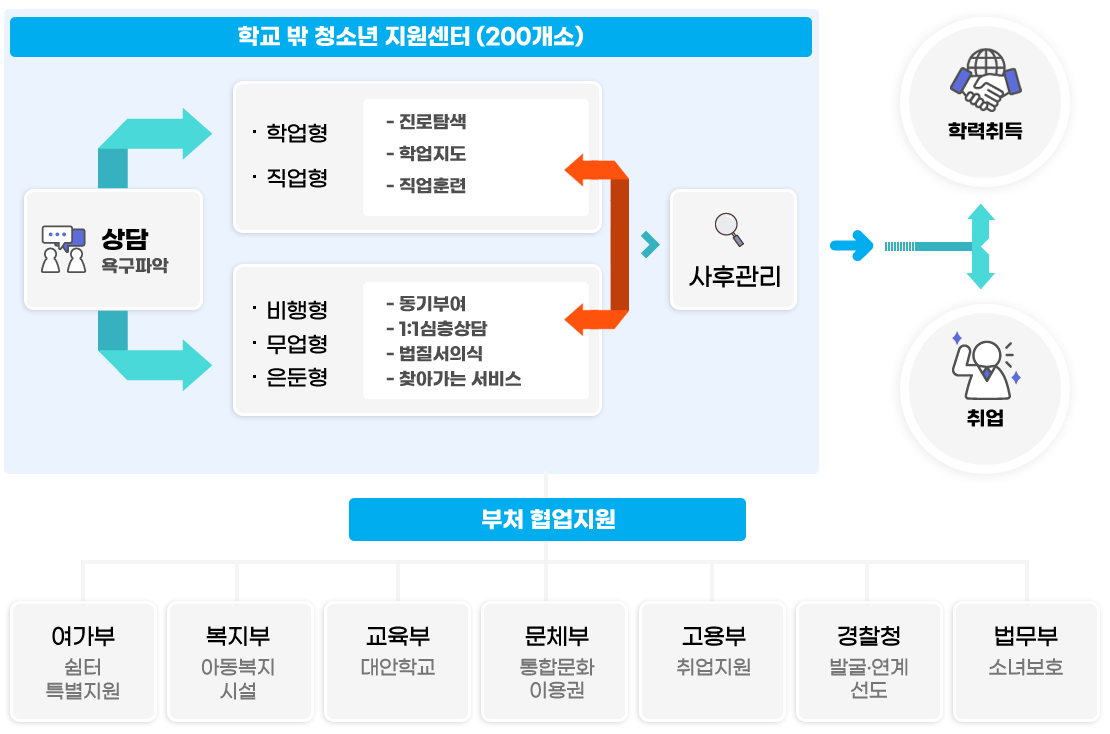 학교 밖 청소년들의 개인적 특성과 수요를 고려한 상담지원, 교육지원, 직업체험 및 자립지원, 취업지원 등을 통해 학교 밖 청소년들이 건강한 사회구성원으로 성장할 수 있도록 지원