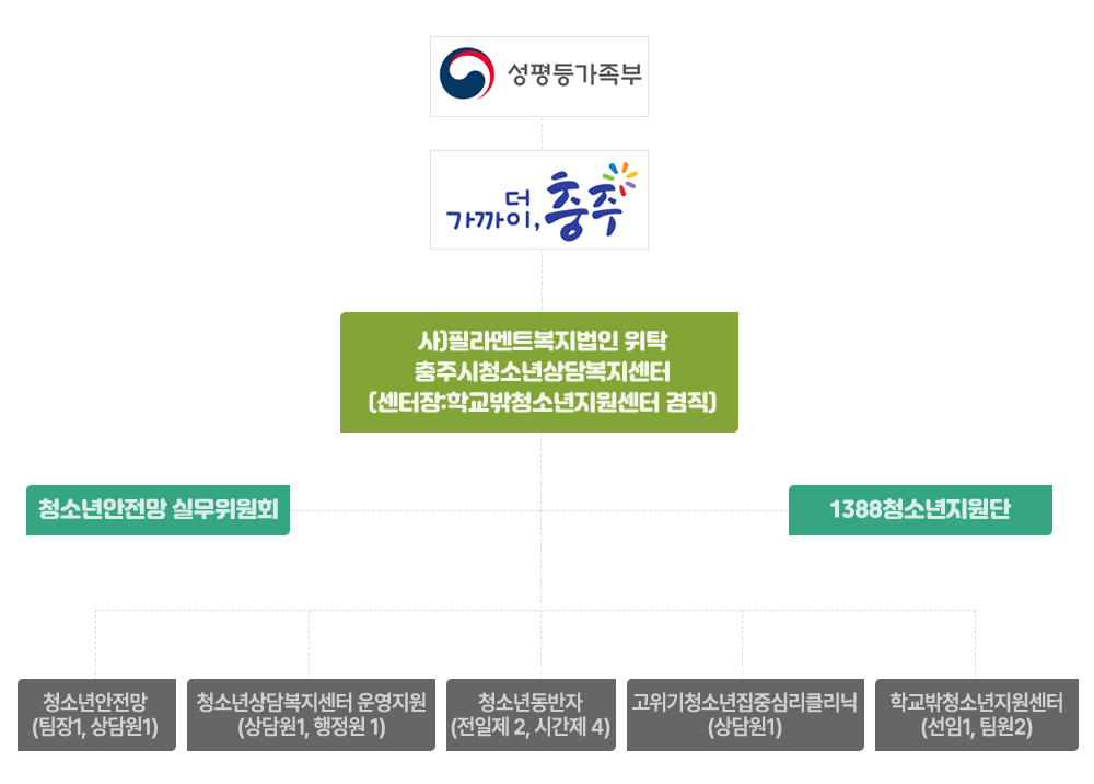 센터안내 인사말 센터소개 및 연혁 조직도 비전 및 미션 오시는길 청소년 상담전화 1388 충주시청소년상담전화 043-842-2007 팩스 043-854-1388 24시간 365일 운영 조직도 센터안내 조직도